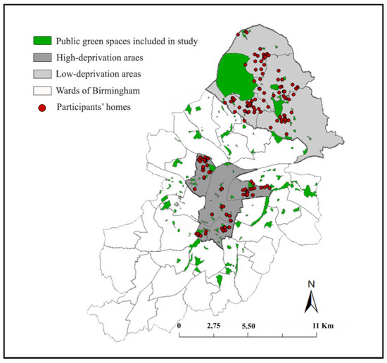 Participants’ homes in low- and high-deprivation areas (adapted from the work of [13]) and digitised public green spaces included in study (data from Birmingham City Council [56] and Ordnance Survey (OS) MasterMap data ©Crown Copyright/database right 2016. An Ordnance Survey/EDINA Digimap (the national data centre for U.K. academics) supplied service).