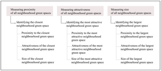 Using measures of proximity, attractiveness, and size of all neighbourhood green spaces, we identified three types of neighbourhood green spaces (i.e., the closest, most attractive, and largest) for each participant [30] (Figure 3). Depending on the number of green spaces available to each participant within a 2 km radius (home-based neighbourhood) and their characteristics, the same green space could be simultaneously the closest, most attractive, and largest green space [30]. Measures of each type of neighbourhood green space characteristic (i.e., proximity, attractiveness, and size)—as well as the number of neighbourhood green spaces—were exported to statistical software (SPSS 24, IBM, Armonk, NY, USA) for statistical analyses.