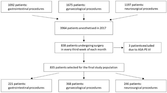 In this prospective observational cohort study, we covered 835 patients who underwent surgery between 1 January 2017 and 31 December 2017 in a tertiary university hospital, including gastrointestinal (n = 221), gynecological (n = 368) and neurosurgical (n = 246) procedures. To select a representative sample from all subjects being anaesthetized (i.e., underwent general and/or regional anesthesia) in 2017, we used a multistage approach, which was a combination of cluster and systematic sampling (i.e., all consecutive subjects anesthetized every third week of each month were included). No a priori power or sample calculation was performed. None of the subjects were missed in the screening period. The selection process of the participants is depicted in Figure 1.