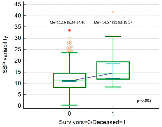Systolic blood pressure (SBP) variability (expressed as SBP_Cv in %), comparison between deceased patients and survivors.