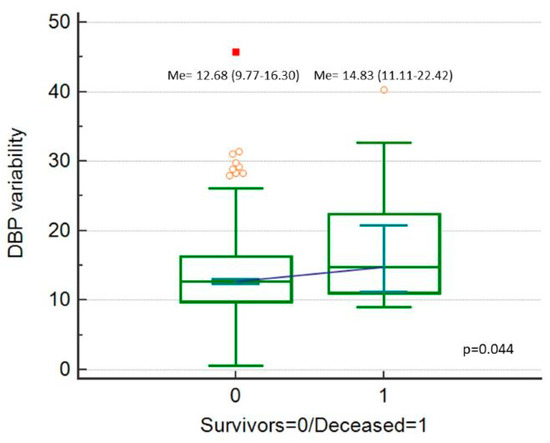 Diastolic blood pressure (DBP) variability (expressed as DBP_Cv in %), comparison between deceased patients and survivors.