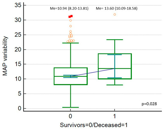 Mean blood pressure (MAP) variability (expressed as MAP_Cv in %), comparison between deceased patients and survivors.