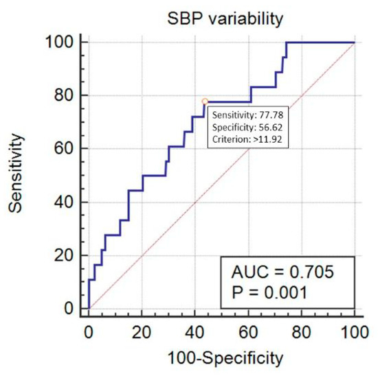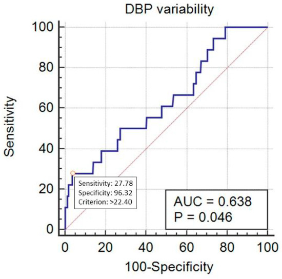 SBP_Cv predicted mortality in a statistically significant way, with AUC = 0.705 (95% CI 0.672–0.735, p < 0.001) at the cut-off point of 11.92% (sensitivity 77.8%, specificity 56.6%) (Figure 5). DBP_Cv also predicted the outcome, with AUC = 0.638 (95% CI 0.605–0.671, p = 0.04) at the cut-off point of 22.4% (sensitivity 27.8%, specificity 96.3%) (Figure 6). Finally, MAP_Cv predicted mortality in a statistically significant way, with AUC = 0.655 (95% CI 0.622–0.688, p = 0.024) at the cut-off point of 13.6% (sensitivity 53%, specificity 73.6%) (Figure 7).