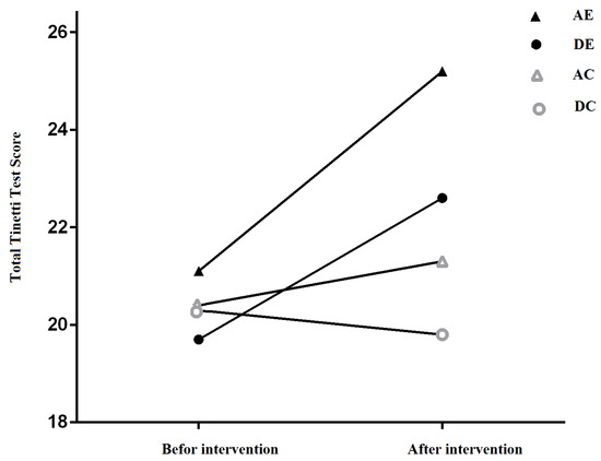 Total postural mobility score based on Tinetti test in the experimental groups before and after the intervention. AE: Aquatic Exercises, DE: Dry-land Exercises, AC: Aquatic Control, DC: Dry-land Control.