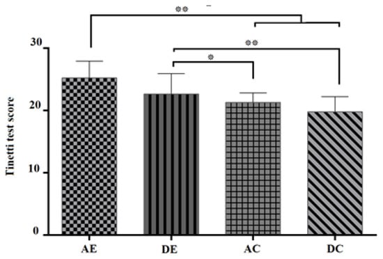The total score of postural mobility is shown in the four groups according to Tinetti test, which is a combination of the balance test (16 points) and the test of standing and walking (12 points), scoring a total of 28 points (Figure 1). The results of covariance analysis for Tinetti test (postural mobility) showed a significant difference in the four groups (AE and DE, AC and DC) (p < 0.001, and F32, 3 = 25.38) (see Table 4). The post hoc test for comparison of the means showed a significant difference between the AE group and the AC and DC groups (p < 0.01) and a significant difference between DE group with the AC (p < 0.05) and DC groups (p < 0.01) (Figure 2).