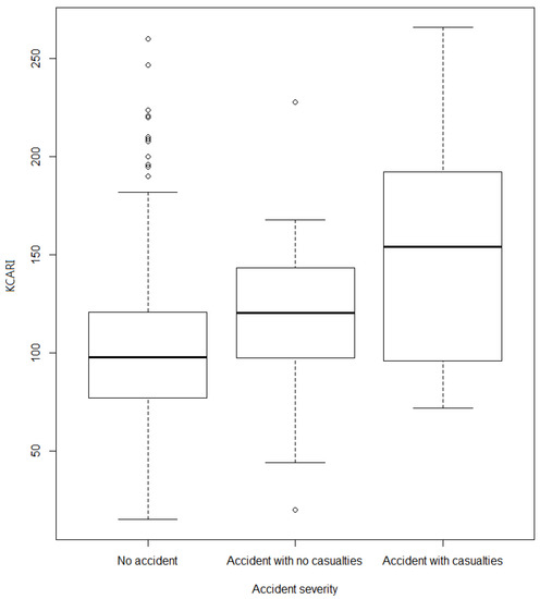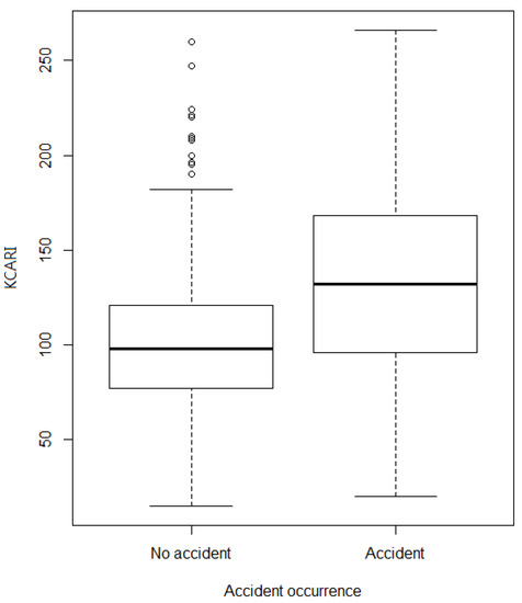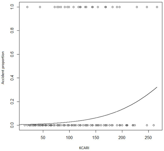 The log odds of the accidents by the increase of KCARI were 0.017, but the coefficient of determination was 0.074 (p-value < 0.001), as shown in Figure 4. The log odds between no accidents and accidents with no casualties by the increase of KCARI was 0.010 (p-value < 0.001). Additionally, the log odds between no accidents and accidents with casualties by the increase of KCARI was 0.025 (p-value < 0.001), but the coefficient of determination was as low as 0.079.