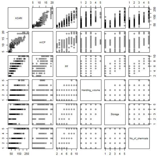 The results of the correlation analysis between the index, factors, and sub-indices that are attributed to the plant indicate the following: the correlation coefficients between KCARI, the two factors of KCARI, and the three sub-indices constituting PF were 0.58–0.90; the correlation coefficients between PF and the three sub-indices constituting PF were 0.40–0.85; the correlation coefficient between mICF and PF was 0.56; the correlation coefficient between the handling volume, storage, and number of chemicals was 0.26–0.47; the correlation coefficients between mICF and the three sub-indices constituting PF were 0.27–0.61. The variation inflation factor between the components of the same layer ranged from 1.22 to 1.41, and multicollinearity was not exhibited. The correlation coefficients between the components of the upper tier and those of the lower tier constituting the upper tier is low to very high, and the correlation coefficients between the same or the non-hierarchical elements are low to moderate [20] and they are relatively low as compared to the former. As a result, the relationships between the components appeared to be appropriate, as shown in Table 4 and Figure 3.
