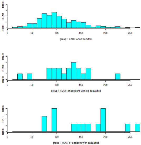 As a result of the discriminant analysis, the coefficient of the linear discriminant function was 0.026, and, as shown in the results of the ANOVA, there was a significant difference between the groups. The reclassification error rate was 3.7%; however, only one of the actual accidents was predicted. As a result, accident prediction through the discriminant function was not successful. Figure 5 shows the KCARI linear histograms by accident severity category.