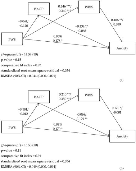 All the analyses were performed using R software, including the lavaan package for conducting multigroup structural equation modeling (SEM). In the multigroup SEM, we used the same model to conduct twice. The model hypothesized that PWS is associated with BAOP, WBIS, and anxiety; BAOP and WBIS are further associated with anxiety. One multigroup SEM used actual weight status to group the participants into OW or non-OW; another multigroup SEM used self-perceived weight status to group the participants into OW or non-OW. For both SEMs, we applied the same fit indices to examine the data–model fit, where a nonsignificant χ2 test together with CFI > 0.9, SRMR < 0.08, and RMSEA < 0.08 indicated satisfactory fit.