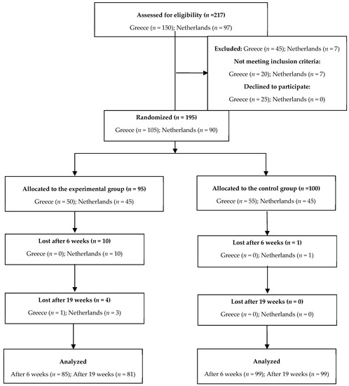 As seen in the flow diagram (Figure 1), 217 people were assessed for eligibility (150 in Greece and 97 in the Netherlands), from which 195 (Greece: 105 and Netherlands: 90) met the inclusion criteria and were randomized in the two groups. More specifically, in Greece, 55 participants were allocated in the control group and 50 participants in the experimental, while in the Netherlands, 45 participants were allocated in each group. After 6 weeks, 11 participants were lost to follow-up and 4 additional participants after 19 weeks. Participants were lost in the follow-up when they did not fill in the second and/or the third questionnaire. Therefore, the final analysis was based on 184 participants for the 6-week period and on 180 participants for the 3-month period.