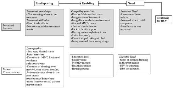 Framework of predisposing factors, enabling factors and the need for hepatitis C virus (HCV) treatment. Methadone maintenance treatment (MMT). Human immune-deficiency virus (HIV). Hepatitis B virus (HBV)