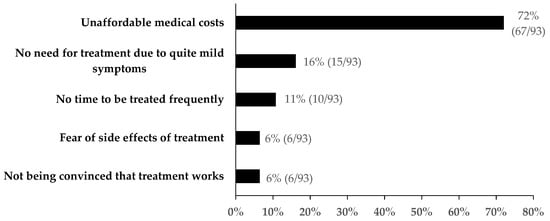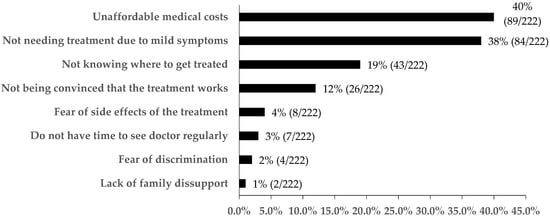 The reasons for not initiating treatment are shown in Figure 2. The most common reasons included unaffordable medical costs (40%, 89/222), not needing treatment due to mild symptoms (33%, 74/222), not knowing where to get treated (19%, 43/222), and not being convinced that the treatment works (12%, 26/222).