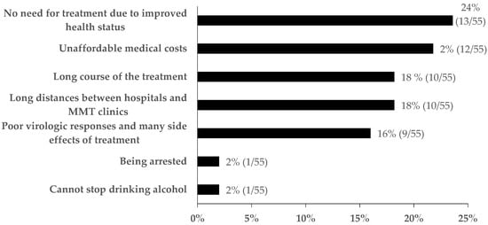 The reasons for discontinuing treatment are shown in Figure 3. The most common reasons were no need for treatment due to improved health status (24%, 13/55) and unaffordable medical costs (22%, 12/55). In addition, long distances between hospitals and MMT clinics (18%, 10/55), long course of treatment (18%, 10/55), poor virologic responses and side effects of treatment (16%, 9/55) were also common reasons.
