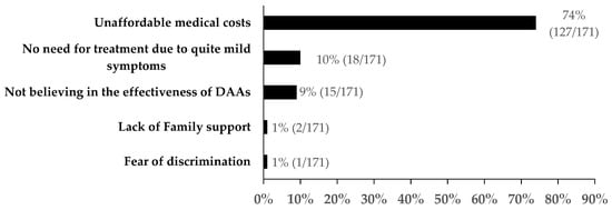 After DAAs were introduced to those who reported HCV infection, 53% (195/366) expressed a willingness to use DAAs and initiate treatment. Specifically, among those who did and did not initiate treatment, 73% (105/144) and 40% (90/222) expressed a willingness to accept DAAs, respectively. The reasons for patients’ unwillingness to accept DAAs are shown in Figure 5. Unaffordable medical costs (74%, 127/171) and no need for treatment due to very mild symptoms (10%, 18/171) were the major barriers to accepting DAAs. Not believing in the effectiveness of DAAs (9%, 15/171) was another common reason.