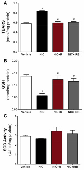 Effect of resveratrol supplementation on changes in (A) TBARS level, (B) GSH level and (C) SOD activity in rat kidneys after 28 days of nicotine administration. * p < 0.05 vs. vehicle and # p < 0.05 vs. NIC group using Tukey post-hoc test.