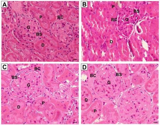 Representative images of kidney sections stained with PAS staining (40× magnification, scale bar = 20 μm) for (A) Vehicle, (B) NIC, (C) NIC+R and (D) NIC+IRB groups respectively. G, glomerulus; BC, Bowman’s capsule; BS, Bowman’s space; P, proximal tubule; D, distal tubule.