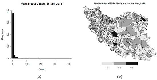 The Iranian National Population-based Cancer Registry (INPCR) recorded cancers according to coding system of the International Classification of Diseases for Oncology ICD-O-3. The INPCR covered 98% of the total population in 2014 []. The number of reported cases of male breast cancer are based on code C50 and had a low incidence in Iran. Only 303 cases were reported for 429 counties in 2014 with the average of 0.71 per region. Unfortunately, regarding the importance of spatial patterns and environmental risk factors in the diagnosis and prevention of cancers, there is no geographic study on male breast cancer in Iran.