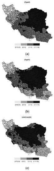 According to the results and advantages of the BYM2, we performed the male breast cancer mapping based on the BYM2 model. Figure 2 shows maps of the estimated relative risk () of male breast cancer across 429 counties in Iran using the BYM2 model for type0, type1 and joint model.