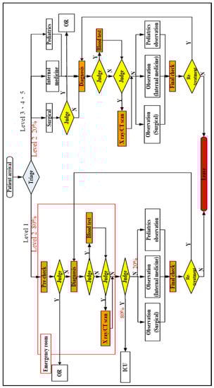 In this section, we discuss the patient flow in the ED of Chung Shan Medical University Hospital. After the patients arrived in the ED, they would be classified and diagnosed using the Five-Level Taiwan Triage and Acuity Scale. The scale based on the severity of the patient injury is for identifying the priority of the treating sequence. There were five acuity levels in descending order: level 1 (resuscitation), level 2 (emergent), level 3 (urgent), level 4 (less urgent), and level 5 (not urgent). The first step of diagnosis was that a level 1 patient and 80% of the level 2 patients were sent to the emergency room and they would be checked if a surgery was needed. 20% of the level 2 patients and the rest of the patients would go to the surgical, internal medicine, or pediatrics consulting room. The second step was that patients would be checked, given blood and urine tests, and/or further checked by magnetic resonance imaging (MRI), X-ray or other tests. Next, the doctor judged if the patients were to be kept under observation or were admitted. These patients would then be sent to the first observation section (internal medicine), second observation section (internal medicine), surgical observation section, pediatrics observation section, or temporary observation section until they were admitted or left. The ED patient flow diagram is shown in Figure 2.