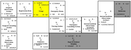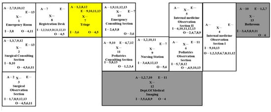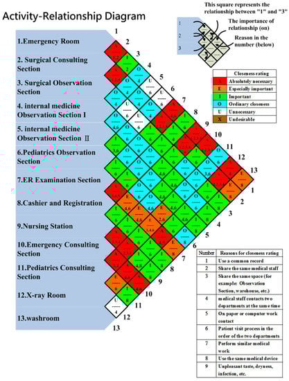 In this stage, we first discovered the relationship between each facility unit based on the closeness rating. We classified five closeness ratings to measure the importance of relationships in our study, which were absolutely important (A), extremely important (I), important (I), unimportant (U), and undesirable (X). In the panel meeting, we discussed with the ED staff the segmenting of the ED facility into 13 sections. In the discussion, nine reasons with reason codes for closeness ratings were identified: