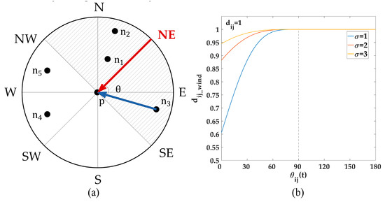 14]. In these studies, the distance between the target site and other sites were calculated, and the K-nearest sites were selected and input to the model for training. Thus, it can decrease the number of input features, and avoid the interference of less relevant sites. The most popular distance criterion employed is the geographical distance, but pollutant diffusion processes are based on wind. However, these models neglected wind when selecting related sites.