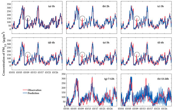Figure 7 show that, during 13–24 h, the range of the predicted PM