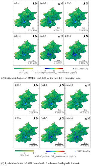 Figure 8 presents the spatial distribution of prediction error in each fold for the next 1–6 h prediction task. The bluer the color, the lower the prediction error (