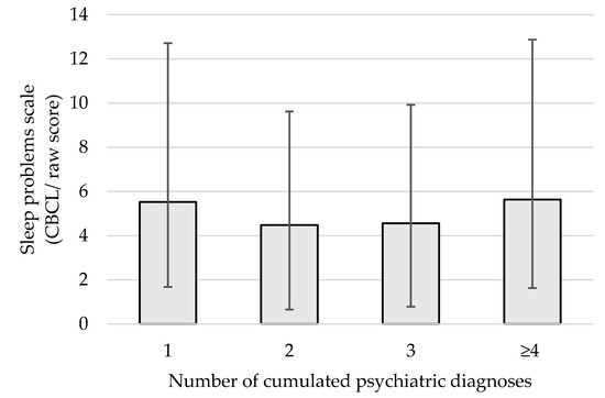 The mean raw total score on the CBCL sleep problems scale did not vary as a function of the number of cumulated psychiatric diagnostic categories, F(3, 198) = 0.683, p = 0.56 (Figure 1).