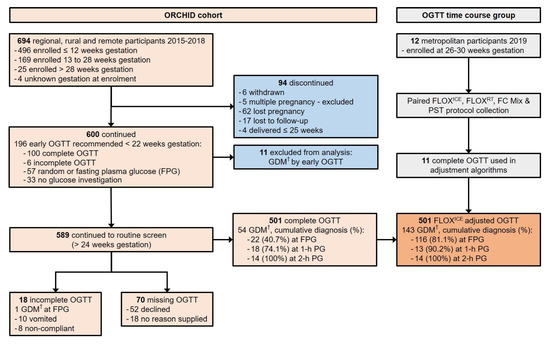 Flowchart for prospective ORCHID cohort participation and OGTT time course group participation, documenting completion of recommended screening for hyperglycaemia in pregnancy by 75 g oral glucose tolerance test (OGTT). ORCHID = Optimisation of Rural Clinical and Haematological Indicators for Diabetes in pregnancy; GDM = gestational diabetes mellitus; PG = plasma glucose; FLOXICE protocol = fluoride-oxalate (FLOX) samples stored immediately on ice; FLOXRT protocol = FLOX samples stored at room temperature (RT); FC Mix protocol = fluoride-citrate-EDTA samples stored at RT; PST protocol = lithium-heparin plasma separation tubes centrifuged within 5 min of collection at 1300× g for 5 min and stored at RT. † GDM diagnosed if one or more International Association for Diabetes in Pregnancy Study Groups (IADPSG) 2010 glucose criteria were met: FPG ≥ 5.1 mmol/L; 1-h PG ≥ 10.0 mmol/L; 2-h PG ≥ 8.5 mmol/L.