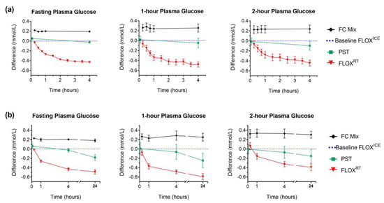 Plasma glucose (PG) in different preservatives compared to FLOXICE protocol: fluoride-oxalate (FLOX) samples stored immediately on ice; mean glucose concentration measured in plasma from whole-blood aliquots centrifuged at 15 min, 30 min, and 45 min were used to calculate baseline FLOXICE value (dotted blue line). Lithium-heparin plasma separation tubes (PST) were centrifuged within 5 min of collection; separated plasma fraction remained in the collection tube for storage and measurement. All comparison samples; fluoride-citrate-EDTA (FC Mix); centrifuged PST; and fluoride-oxalate (FLOXRT), were held at room temperature for the first 4 h post-collection (fasting PG, n = 12; 1-h and 2-h PG, n = 11). Plasma for PG measurement separated from FC Mix comparison samples following centrifugation of whole-blood aliquots at regular time intervals (h: 0.25; 0.5; 0.75; 1; and 4). Plasma for PG measurement separated from FLOXRT samples following centrifugation of whole-blood aliquots collected at regular time-intervals (h: 0.25; 0.5; 0.75; 1; 1.5; 2; 2.5; 3; 3.5; and 4). For FC Mix and FLOXRT samples, time represents the time from collection to centrifugation. For PST samples time represents time from collection to centrifugation for initial measurement (5 min) and time from collection to analysis for subsequent measures. (a) Data represent mean (± SEM) difference in PG over 4 h from each comparison sample compared to baseline PG (fasting PG, n = 12; 1-h and 2-h PG, n = 11). (b) Following 4 h incubation at room temperature, comparison samples from six participants were transferred to refrigerator (4 °C) for overnight storage. At 24 h, plasma was separated from FC Mix and FLOXRT samples following centrifugation of whole-blood aliquots for PG measurement; plasma fraction from previously centrifuged PST remained in the tube for overnight storage and PG measurement. Data represent mean (± SEM) difference in PG from each comparison sample at 24 h compared to baseline PG (n = 6). Difference in PG for FC Mix and FLOXRT samples at 0.25 h, 1 h, and 4 h compared to baseline and PST comparison samples at 5 min, 1 h, and 4 h compared to baseline, plotted for the six participants for direct comparison with 24 h difference.