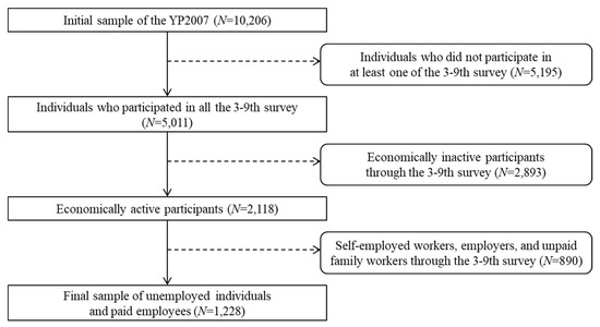 N = 2118). Economically active people comprise unemployed individuals seeking work and employed individuals (paid or unpaid). Since the employment status of employees was the focus of our study, we included only paid employees among the employed, and excluded self-employed workers, employers, and unpaid family workers at all time-points, for whom the quality of employment could not be estimated. As a result, the final sample of the present study consisted of 1228 individuals who were unemployed or paid employees.