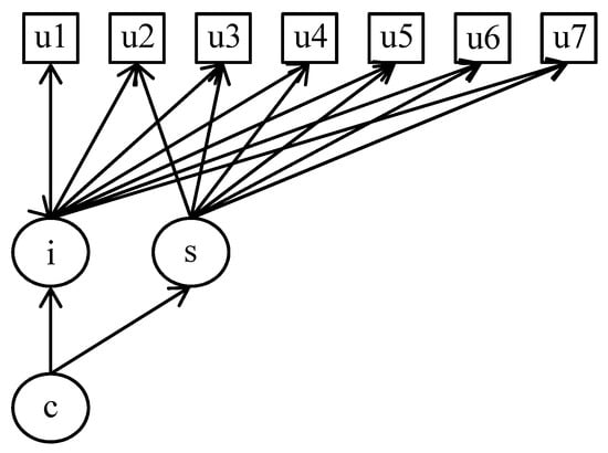 Figure 2 presents the LCGA model in which latent classes are explored using tri-categorical variables across seven time-points (u1–u7). In the model, i (intercept) and s (slope) are latent growth factors, which are formed by the observed variables u1–u7, and then, the latent classes c are determined by i and s.