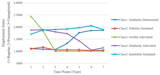 N = 94, 7.65%) as individuals in this group were initially regularly employed but gradually transitioned to unfavorable employment conditions over a period of seven years. Class 2 was “stability sustained” group (