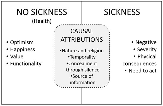The inter-relation between the categories found shows that the RC have a dichotomous worldview regarding non-sickness (health) and sickness mediated by causal attribution (Figure 1). Their worldview is polarized into two values: not sick/sick. When not sick, optimism is prioritized along with happiness, and these are highly valued, as they also possess a physical and social function. When it is observed that one is sick, it is understood that it is a severe, negative state of health, with visible physical ramifications, and this is when the need to act becomes clear. When faced with the need to act, the behavior of the RC is mediated by causal attributions, influenced by nature and religion, temporality, concealment by not mentioning the disease, and the origin of the information.