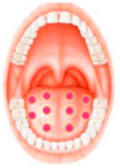 A 42-year-old man underwent intensified head and neck radiotherapy and was referred to the clinic with a chief complaint of a complete loss of taste function and a sensation of mouth burning. The patient signed a written informed consent before his engagement in the study. According to a thorough clinical examination, the diagnosis was a taste alteration due to direct neurological toxicity of the taste buds cells of the tongue. In order to assess the severity of the taste alteration, the International Standards Organization (ISO) ISO 3972:2011 for the measurements of taste alteration was used. Sweet, salty, sour, bitter, and umami were each tasted in a single “sip and spit” technique after a rinse of the mouth with room-temperature, purified water three times before and after sampling and expectorating each solution. The solutions and their corresponding concentrations were sucrose 300 mM, NaCl 200 mM, citric acid 5 mM, caffeine 10 mM, and monosodium glutamate (MSG) 200 mM. Perceived taste quality was identified by selecting one of seven choices. Correct responses were sweet for sucrose, salty for NaCl, sour for citric acid, bitter for caffeine and savory for MSG. Further choices were none or metallic. The score was assigned as 0–5 correct choices—if the patient failed to identify the correct taste (0) and if the answer was correct (1). Before any examination and data collecting, the patient was asked to stop eating and to drink only water at least one hour prior to testing. The taste alteration score was zero out of five before treatment. In addition, in order to assess mouth-burning sensation, visual analogue scale (VAS) was used where 0 represented no pain at all and 10 represented the greatest pain. VAS scale was measured before and after 24 h of each treatment (Table 8). PBM therapy was the treatment of choice. For the management of taste alteration, one session of PBM therapy was carried out each 24 h for five consecutive days, and the same procedure was repeated after 48 h. The irradiated areas were 10 points on the dorsum of the tongue, three points on the right lateral of the tongue, and three points on the left lateral of the tongue (Figure 3). Diode laser 635 nm (smart M Pro, Lasotronix, Poland) was used with an energy density of 3 J/cm2, 30 s of irradiation, output power of 100 mW, continuous and contact mode (Table 9). For the management of burning mouth sensation, diode laser 635 nm was used with the same previous parameters on the following areas: Three points on the tongue, four points on the lateral border of the tongue, 10 points on the dorsal surface of the tongue, eight points on the buccal mucosa, five points on the labial mucosa, eight points on the hard palate, three points on the soft palate, three points by sextant on the gingiva (Table 9). After PBM therapy, the taste alteration score was 5/5 (Table 8). According to the results, PBM can be considered as an effective approach for the management of taste alteration in cancer patient.