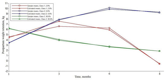 The distinct PPWR trajectories for the three-class solution is presented in Figure 1. Class 1 trajectory (n = 26, 2.8%) showed an inverted U-shape trajectory which started at a moderate PPWR at 1 month postpartum. Approximately 6.6% of the sample (n = 61) was assigned to Class 2 trajectory, with the lowest maternal weight retention at 1 month postpartum and a rapid increase in the rate of PPWR during the first eight months after delivery. More than 90% of participants were classified into Class 3 trajectory (n = 837), with a higher initial level of weight retention and a significant decrease in the rate of PPWR. The overall trajectory of PPWR is shown in Figure S1. As more than 90% of participants were classified into Class 3, the changes in the overall trajectory for PPWR were mostly close to the Class 3 trajectory.