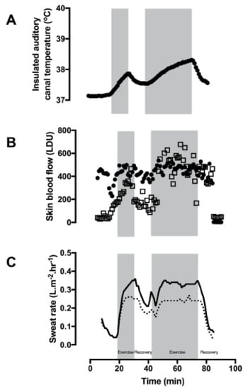 Many cooling strategies rely upon good skin blood flow [,,]. Brengleman et al. [] studied a family affected with ED, showing that active vasodilatation was absent in response to elevations in Tac. Removal of excess heat requires warm blood to perfuse the cutaneous circulation and be cooled. For each liter of blood at 37 °C that flows through the skin and returns to the deeper tissues at 36 °C, the body loses roughly 1 kcal of heat. As the maximum skin blood flow can be as much as 3 to 4 L/min, the same 1 °C fall in the temperature of the blood would offload up to 4 kcal/min (280 W) []. Consequently, to remove excess stored heat efficiently, methods of cooling using hand and foot immersion rely upon high skin blood flows to areas in contact with the cooled skin [,]. Although the use of an ice vest is more efficient and cools the deep body more quickly if there is a high skin blood flow, if a high skin blood flow is not present, conductive cooling through the layers of tissues still occurs but cools the Tac more slowly. Vasodilatation in the forearm and high finger skin blood flows can be seen in both participants in this case report and therefore immersion of the hands in cold water would be a useful cooling intervention. The differences in the magnitude of the skin blood flow values reported between participants is likely to be due to the site-specific nature of the laser Doppler measurements. In addition, the skin blood flow on the chest was not directly measured, but both participants had good capillary refill when the skin was blanched before and after exercise and heat exposure. Therefore, active cooling using water immersion of the hands and feet or wearing an ice vest would be effective in cooling both participants described here.
