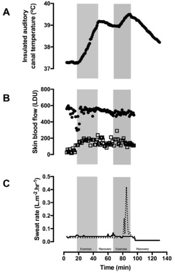 Participant 2 during exercise and recovery in 30 °C air and 50% relative humidity. (A) Insulated auditory canal temperature (Tac), (B) finger skin blood flow (closed circles), forearm skin blood flow (open squares), and (C) sweat rate on the chest (dashed line) and back (solid line). Exercise was performed during the gray shaded sections.