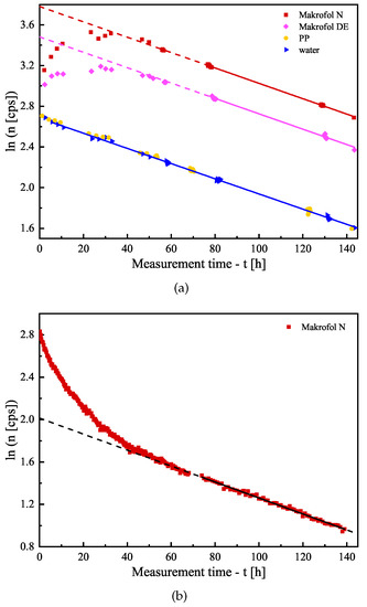 Signal follow-up (in semi-logarithmic scale) of several samples measured at the liquid scintillation counter in Cherenkov-counting mode: (a) unexposed polymer foils immersed in water with radon activity and (b) a Makrofol N foil exposed to radon immersed in distilled water. The points are the experimental data (the uncertainties—not shown, are within the size of the symbols), the solid line is a linear fit of the data, and the dashed line is extrapolation of the fit for better visualization. The signals decrease linearly in semi-log. scale (i.e., exponentially) and the slopes are very close.