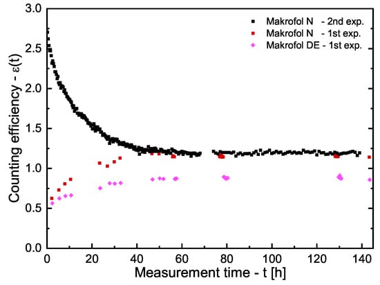 In this series, one more experiment was carried out: a Makrofol N foil was exposed to radon and then immersed in an LS glass vial full with distilled water—in the same way, the further experiments on K and estimation are made. The purpose was to check if it matters for the counting efficiency in which direction the activity redistribution between water–polymer goes. In this experiment, only Makrofol N foil was used for two reasons: first, Makrofol N has the highest absorption ability, so it is the best for the counting statistics and, second, the change of the signal due to the redistribution is most pronounced for Makrofol N. Again, the signal from the foil was followed by the LS-counter (see Figure 1b) and measured several times at the HPGe detector. In this case, the LS-counting shows a faster decrease of the Cherenkov signal (due to desorption of the activity from the Makrofol N foil in the water, thus the Cherenkov efficiency decreases) in the first 60–70 h and, then, after equilibrium is reached between the radon in the two phases polymer–water, the signal decrease becomes exponential as in the previous experiment. Again, the gamma–spectrometry shows a single exponential decrease for the entire time of the follow-up. Additionally, the Cherenkov counting efficiencies as a function of time [dimensionless] were estimated for all foils in the two experiments using the net LS-counting rate [s−1] and the gamma-spectroscopically measured activity in the sample :