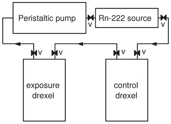 A scheme of the exposure system. In the beginning of the exposure, the activity of the radon source was promptly introduced in the system by the pump. Then, the valves “V” were closed, and the system was disconnected.