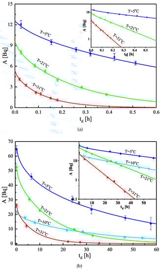 Experimental data (points) and theoretical curve fits (solid lines) of the desorption follow-up of radon from (a) High-density polyethylene and (b) Makrofol DE foils for the estimation of the partition coefficient and diffusion length at different temperatures. To fit the same scale, the activity data of Makrofol DE at 10 °C are multiplied by 10, as the radon activity concentration in this experiment was one order of magnitude lower than in the other three. The uncertainties are at the level of 1. The embedded smaller graph presents the same data in semi-log scale—it is seen that, in the early desorption the dependences are nonlinear in semi-log scale, i.e., they are sums of several exponents rather than single exponents.