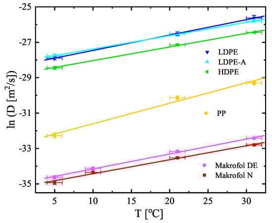 Temperature dependence of the diffusion coefficients of the studied materials. Note that the dependence is ln(D) vs. T. The points are the experimental data and the solid lines are linear fits of the data. The uncertainties are at the level of 1.