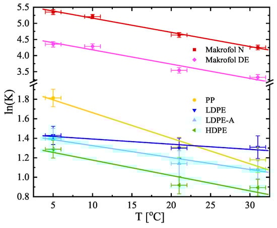Temperature dependence of the partition coefficients of the studied materials. Note that the dependence is ln(K) vs. T. The points are the experimental data and the solid lines are linear fits of the data. The uncertainties are at the level of 1.