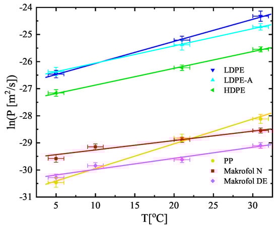 Temperature dependence of the permeabilities of the studied materials. Note that the dependence is ln(P) vs. T. The points are the experimental data and the solid lines are linear fits of the data. The uncertainties are at the level of 1.