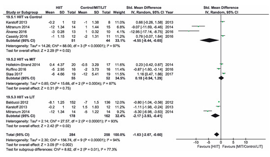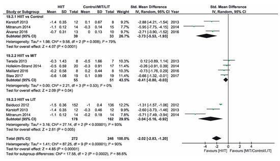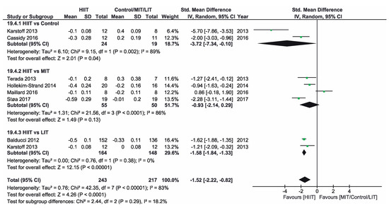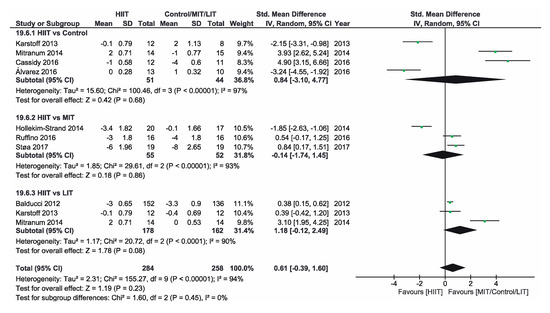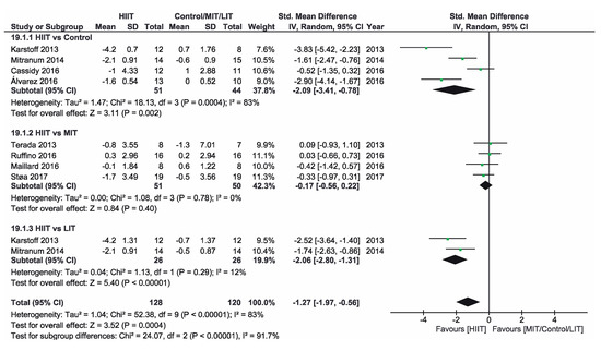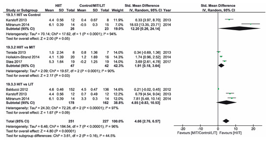 A meta-analysis was carried out to compare changes in the effect size (pre- and post-intervention) between the intervention group (HIIT) and the comparison group (CON, MIT or LIT). The studies were grouped according to the outcome measure, the intervention and the comparison group. For each meta-analysis, the standardized mean difference was calculated, along with the 95% confidence interval (CI). The significance level was set at p < 0.05. Heterogeneity was determined by the chi-square test and the I2 statistic. When homogeneity was observed, a fixed-effect model was used. In the case of heterogeneity, a random-effects model was used. All statistical analyses were carried out by using the statistical software Review Manager (RevMan) 5.3 (The Cochrane Collaboration, The Nordic Cochrane Centre, London, United Kingdom). The results are presented in Forest plots.