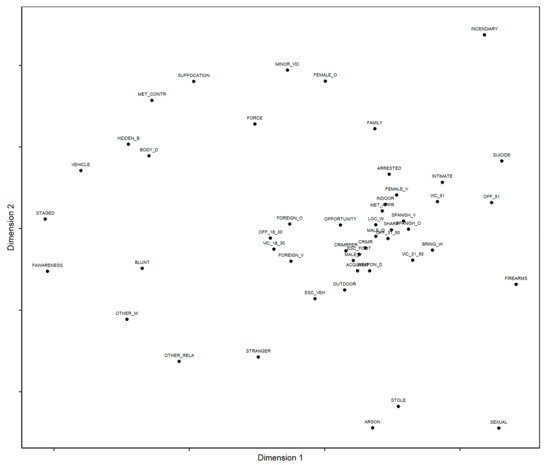 Figure 1 shows the resulting bidimensional nMDS map, with each point corresponding to one of the 49 variables describing the characteristics of the homicide, the modus operandi of the offender, and the characteristics of the offender and victim as defined in Table 1. The spatial configuration of the variables appears, in which the proximity of these indicates the frequency of joint appearance, and, therefore, their thematic similarity.