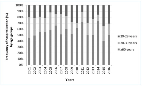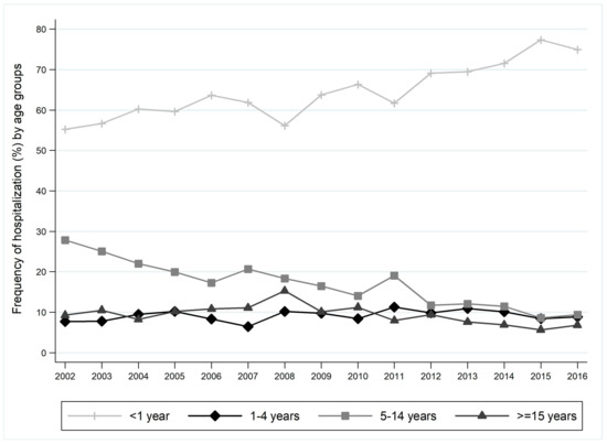 The frequency of hospitalization stratified by age groups showed an increase from 55.26% in 2002 to 74.92% in 2016 in the <1 year age class (Figure 1) with a significant trend (β = 1.37; p < 0.001). A significant decreasing trend emerged for the age classes 5–14 years (β = −1.20; p < 0.001) and ≥15 years (β = −0.28; p = 0.045).