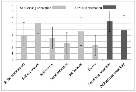The engagement motivators measured with SEEH are shown in Figure 2. For VAD the most significant engagement motivators for refugee aid were self-experience (M = 6.06, SD = 1.80) and social responsibility (M = 6.31, SD = 1.68). The average altruistic orientation of the VAD was 5.63 (SD = 1.79) and the average self-serving orientation was 4.05 (SD = 1.22).