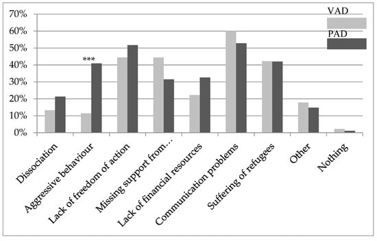 Looking at the individual stress factors in refugee work, there was only one significant difference between PAD and VAD in the area of dealing with aggressive behavior of refugees (χ2 = 11.96, p = 0.001). With respect to the other factors shown in Figure 3, the two groups did not differ significantly.